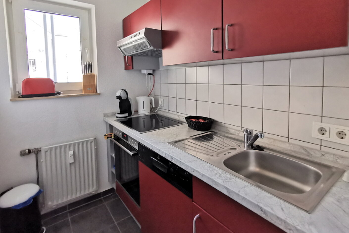 - Voll ausgestattete Küche mit Induktionskochfeld, Geschirrspüler, Kühlschrank mit Gefrierfach, Toaster, Filter-Kaffeemaschine und Kapselmaschine: NESCAFÉ® Dolce Gusto®, Wasserkocher