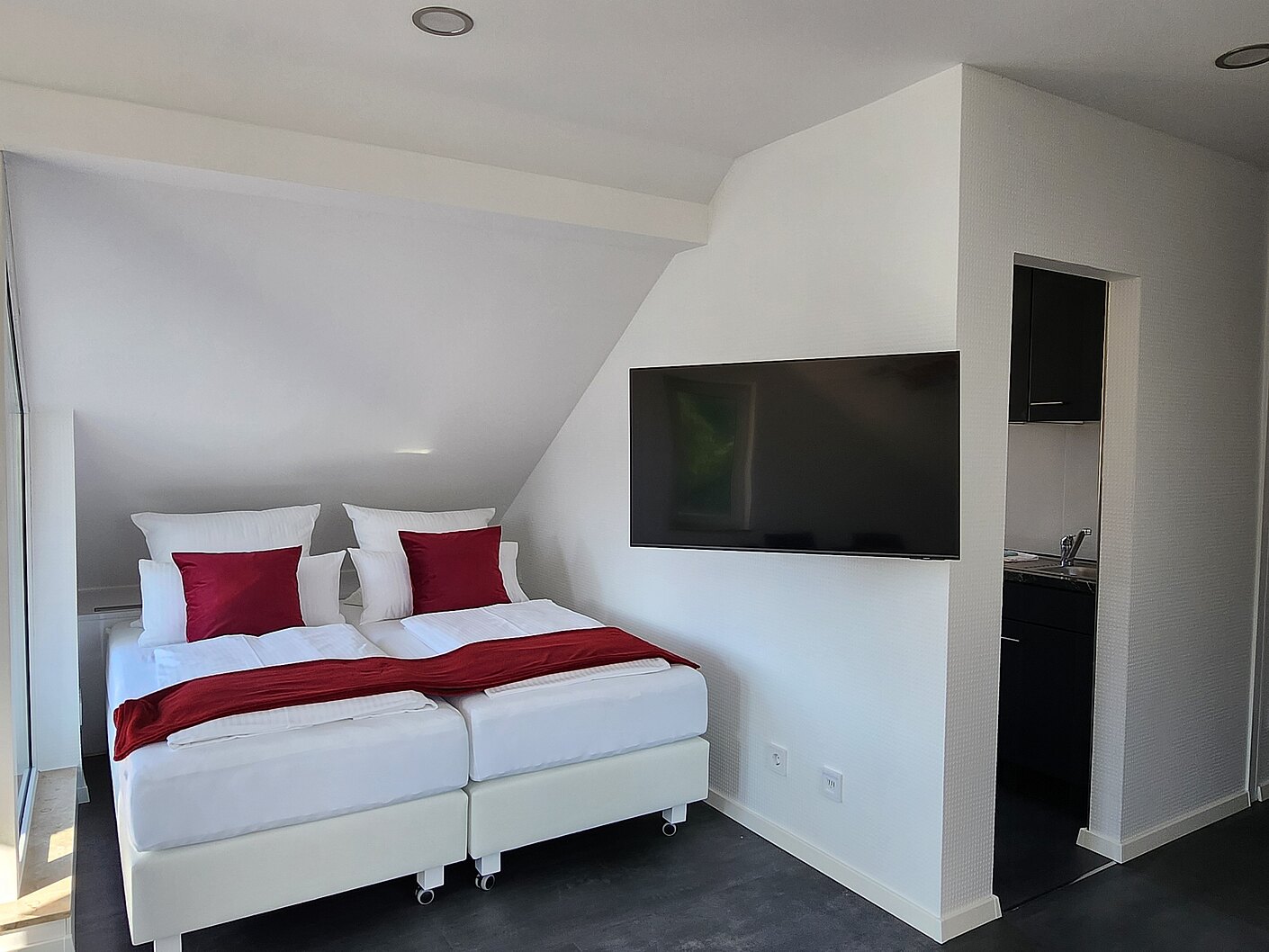 Das gepflegte, exklusiv ausgestattete Apartment bietet Ihnen ein lichtdurchflutetes Wohn-Schlaf-Zimmer mit Sitzecke und einem hochmodernen Fernsehgerät. Zum Essen und – falls Sie im Urlaub nicht darauf verzichten können, auch zum Arbeiten – gibt es einen großzügigen Tisch mit Zugriff auf Steckdosen und USB-Anschlüsse. Eine weitere ausziehbare Arbeitsplatte finden Sie im geräumigen Einbauschrank, der auch genügend Stauraum für Ihr Gepäck bietet.