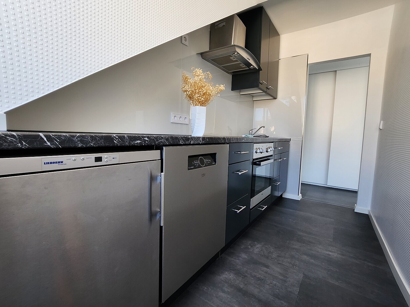 - Voll ausgestattete Küche mit Kochfeld, Backofen, Geschirrspüler, Kühlschrank mit Gefrierfach, Kaffeevollautomat, Elektrogeräten und Geschirrausstattung