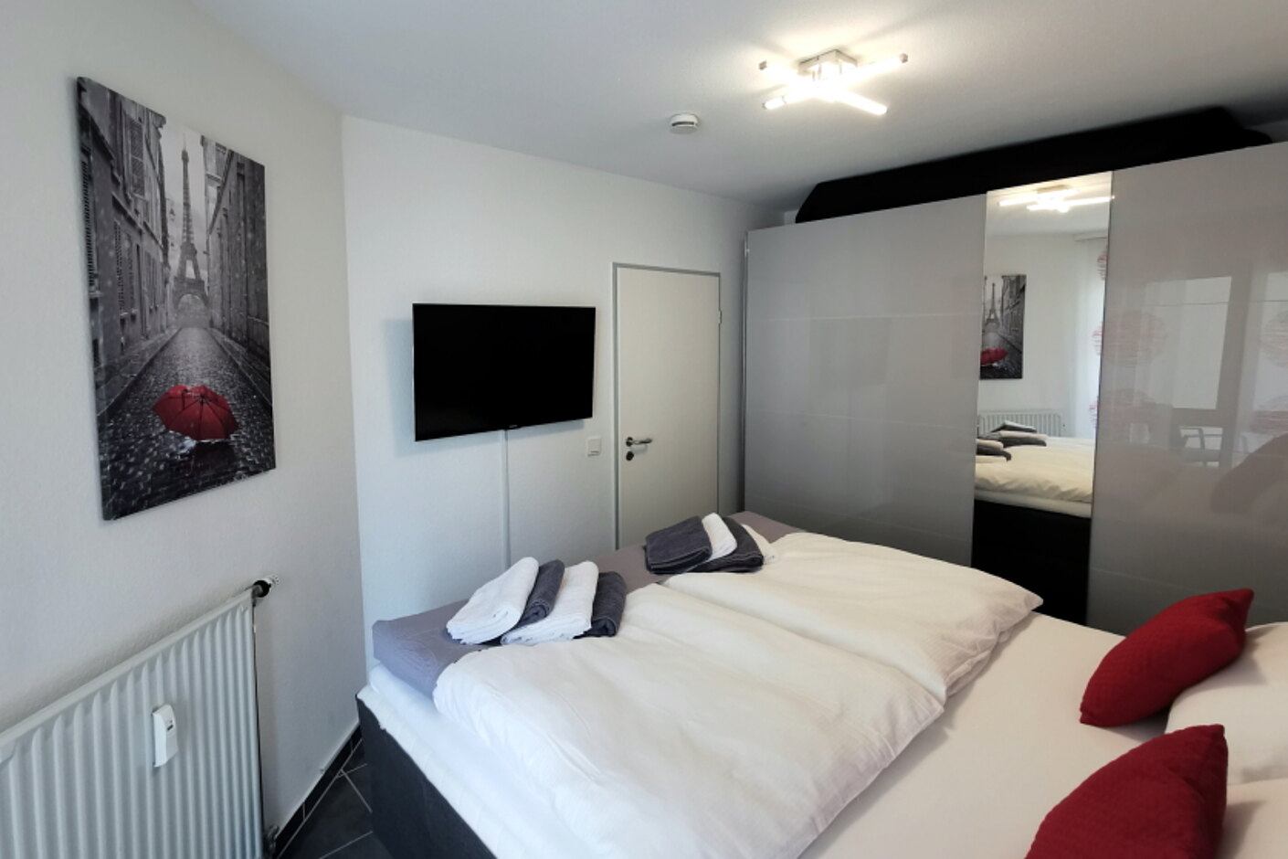 - Schlafzimmer mit Boxspringbett 180x200cm (durchgehende Matratze), Spiegelschrank, LCD Fernseher