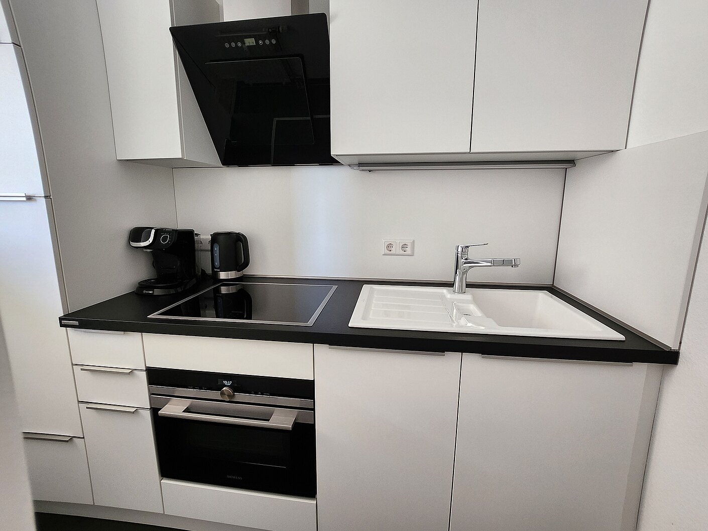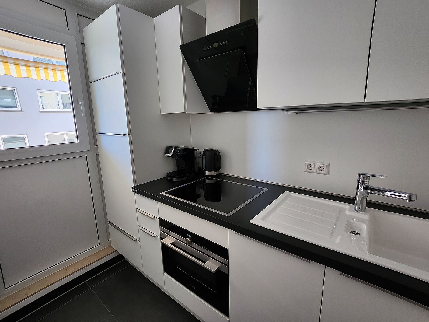 - Voll ausgestattete Küche mit Induktionskochfeld, Backofen mit eingebauter Mikrowelle, Geschirrspüler, Kühl-Gefrier-Kombination, Kaffeemaschine, Elektrogeräten und Geschirrausstattung