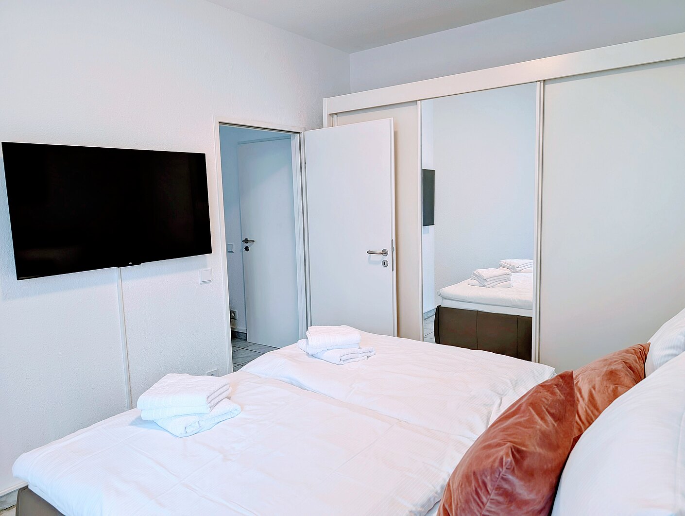 - Schlafzimmer mit Boxspringbett 180x200cm (2 getrennte Matratzen), Spiegelschrank, Fernseher