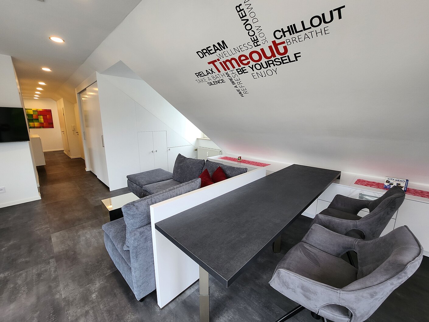 Genießen Sie außergewöhnliche Urlaubstage in unserer komplett renovierten und klimatisierten 5-Sterne-Ferienwohnung im Kurviertel. Die freundliche, helle Einrichtung strahlt mit der Sonne um die Wette. Unser topmodernes, kompaktes Ein-Raum-Apartment mit separater Küche ist bestens geeignet für alle, die minimalistisch-praktischen Komfort und klare Linien bevorzugen. Die Wohnung liegt in der vierten Etage, hat einen separaten Eingang, ein Tageslichtbad mit Dusche und WC und eine geräumige Dachterrasse mit tollem Blick über die Dächer von Bad Kreuznach. Hier sind Sie richtig, wenn Sie Ruhe und Entspannung suchen.